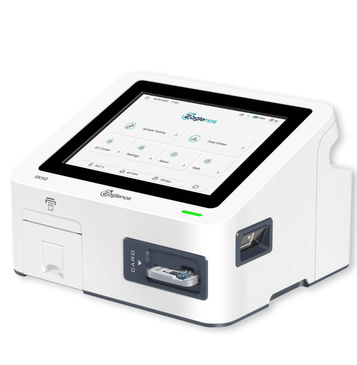 El analizador de gases en sangre de la serie EN102 de EAGLENOS es un dispositivo compacto y portátil, ideal para el punto de atención. Utiliza tecnología microfluídica electroquímica para ofrecer un análisis completo y preciso de hasta 37 parámetros, incluyendo pH, pCO2, pO2, K+, Na+, Cl-, iCa2+, Glucosa, Lactato y Hct.